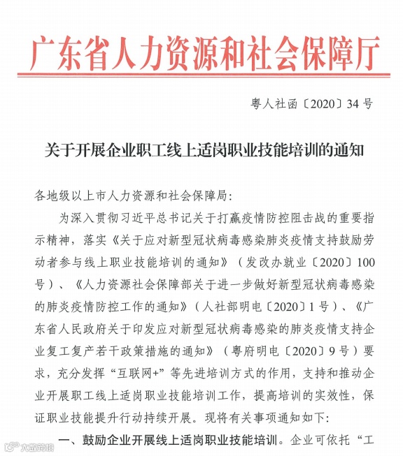 广东省:《关于开展企业职工线上适岗职业技能培训的通知》(粤人社函[2020]34号)