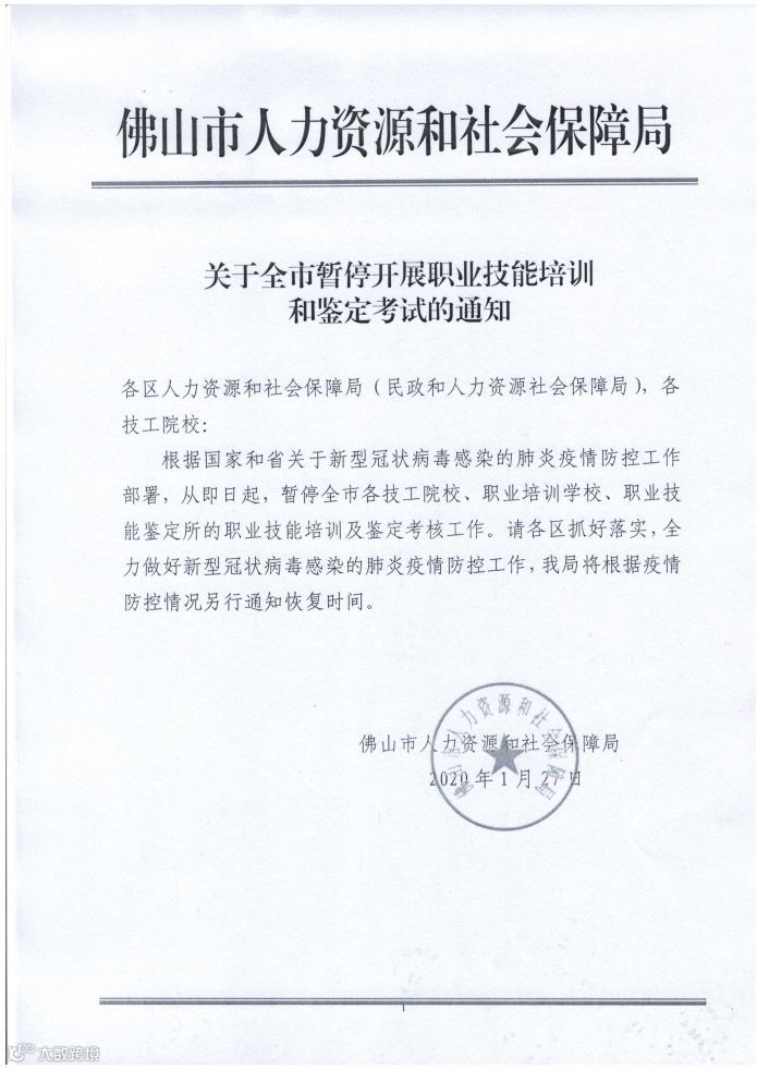 1月27日,佛山市人力资源和社会保障局发布通知:经研究决定,暂停全市各技工院校、职业培训学校、职业技能鉴定所的职业技能培训及鉴定考核工作。全力做好新型冠状病毒感染的肺炎疫情防控工作,将根据疫情防控情况另行通知恢复考核时间。