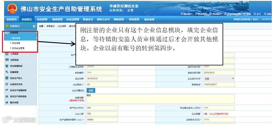 (第一次使用该系统的企业需要注册):对于第一次使用该系统的企业请点击【用户注册】按钮,并按照系统提示注册企业。注册完之后需要登录系统,企业需要填好企业基本信息,然后联系企业所属镇街安监人员,等待企业所属镇街安监局工作人员审核。(刚注册的新企业只有企业信息模块)审核通过后才开放其他系统模块,一般在7个工作日左右审核完毕,审核通过的企业看下面的第四步。