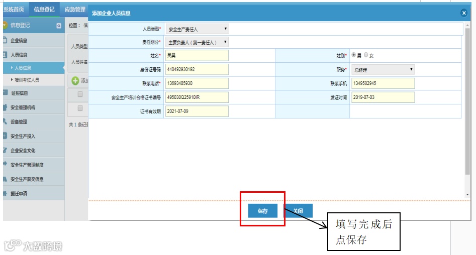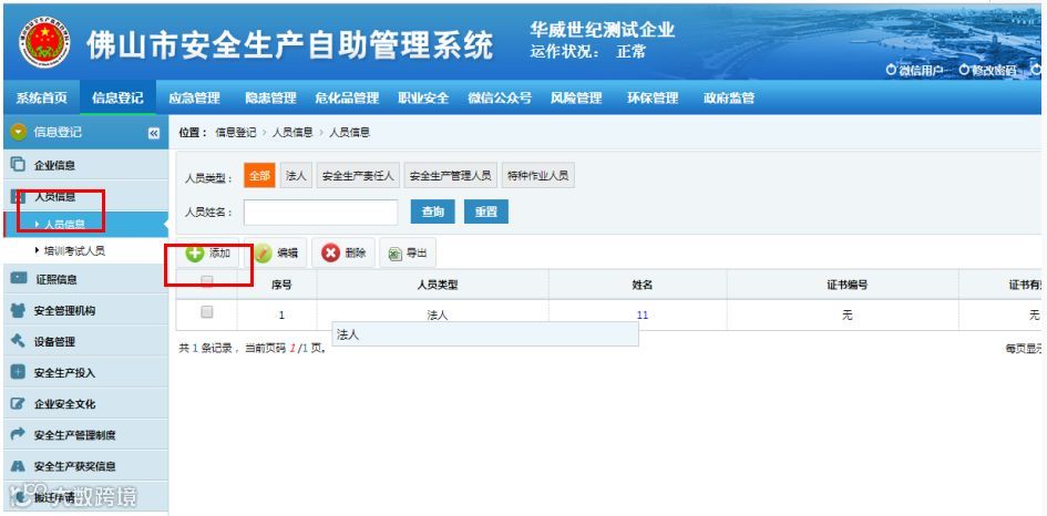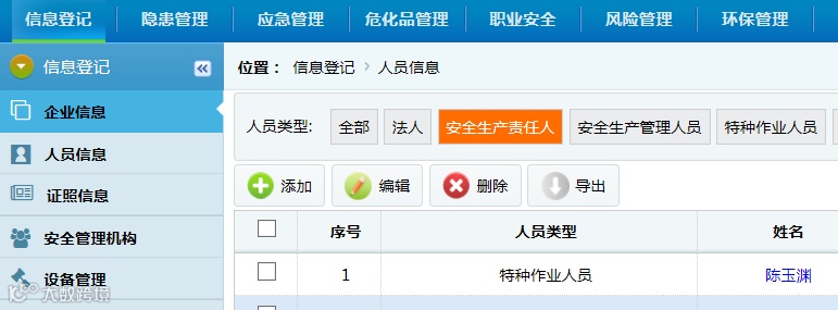 第五步:进入【信息登记】模块后,点击屏幕左侧菜单列表中的人员信息按钮,然后点击添加按钮,根据企业添加法人、安全生产责任人、安全生产管理人员、特种作业人员。