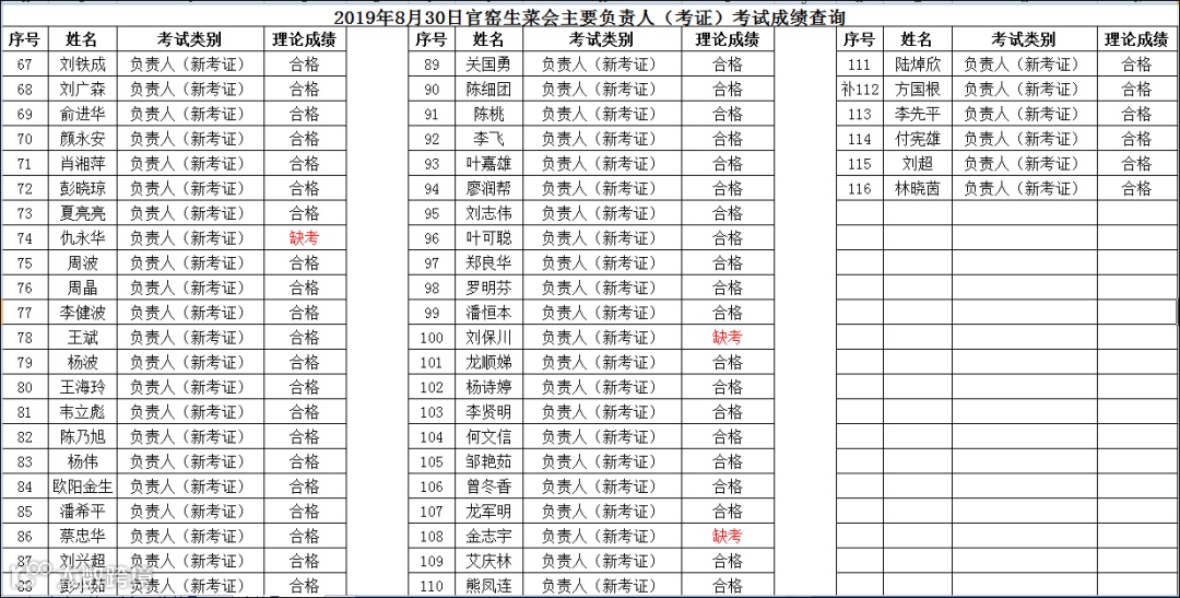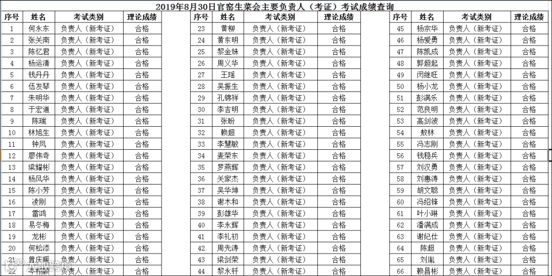 2019.08.30官窑生菜会馆主要负责人(考证)考试成绩查询