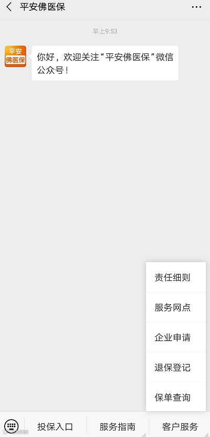 请您关注“平安佛医保”微信公众号,官微右下角设有“客户服务”栏目,您可以一并查询并办理责任细则、服务网点、企业申请、退保登记、保单查询等事项。