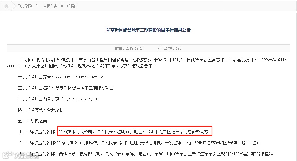 12月27日,中山市公共资源交易中心官宣:华为技术有限公司、华为海洋网络有限公司、西湾信息科技有限公司中标翠亨新区智慧城市二期建设项目!