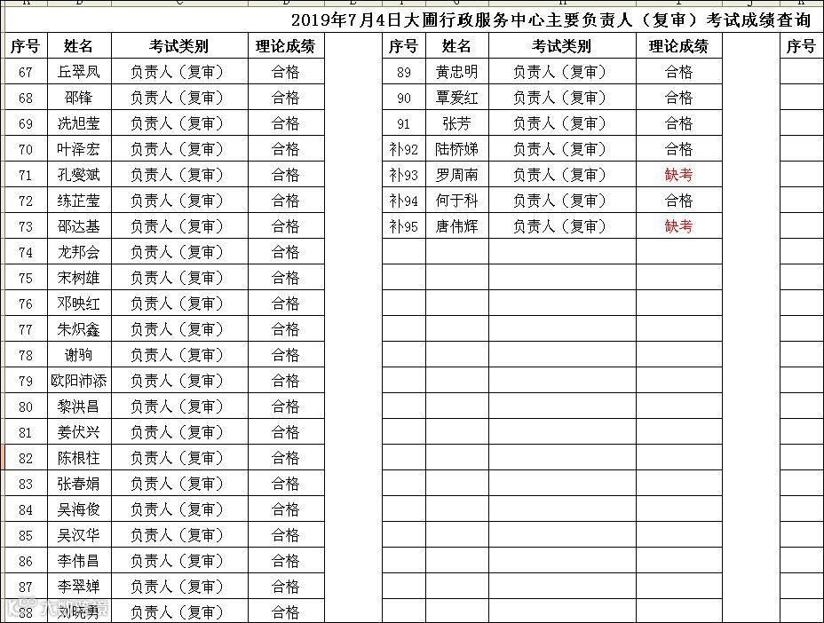 2019.07.04大圃行政服务中心主要负责人(复审)考试成绩查询