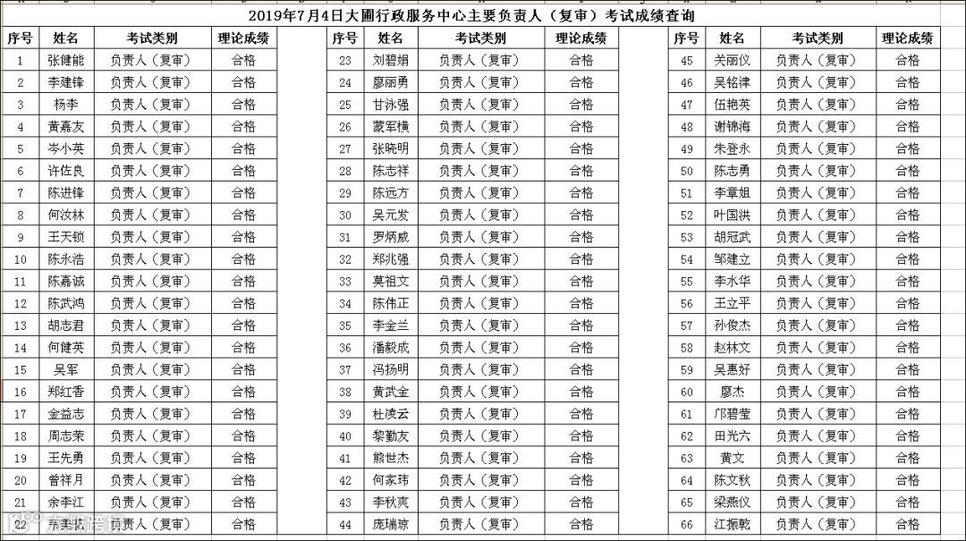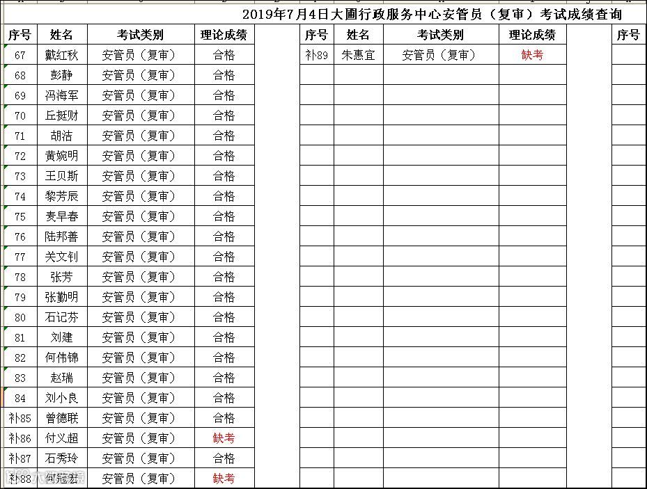 2019.07.04大圃行政服务中心安管员(复审)考试成绩查询