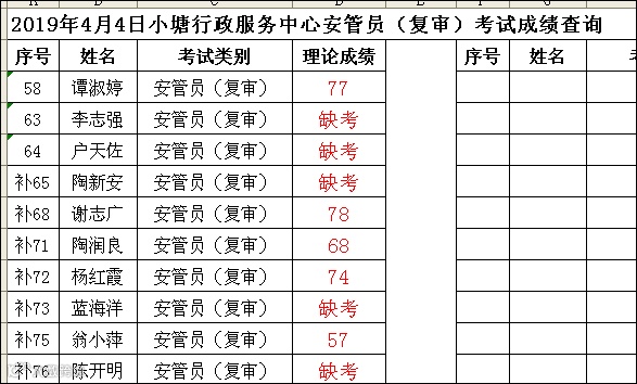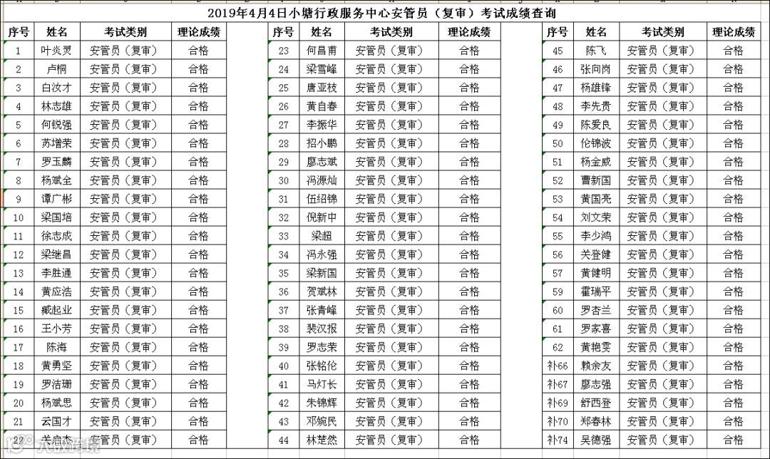 2019.04.04小塘行政服务中心安管员(复审)考试成绩查询