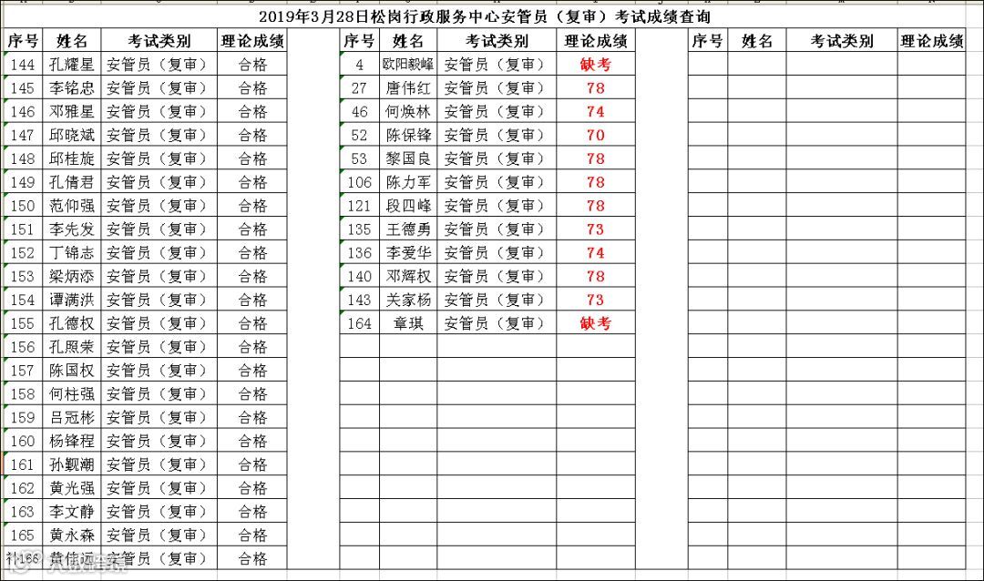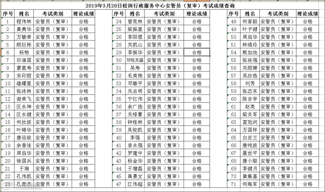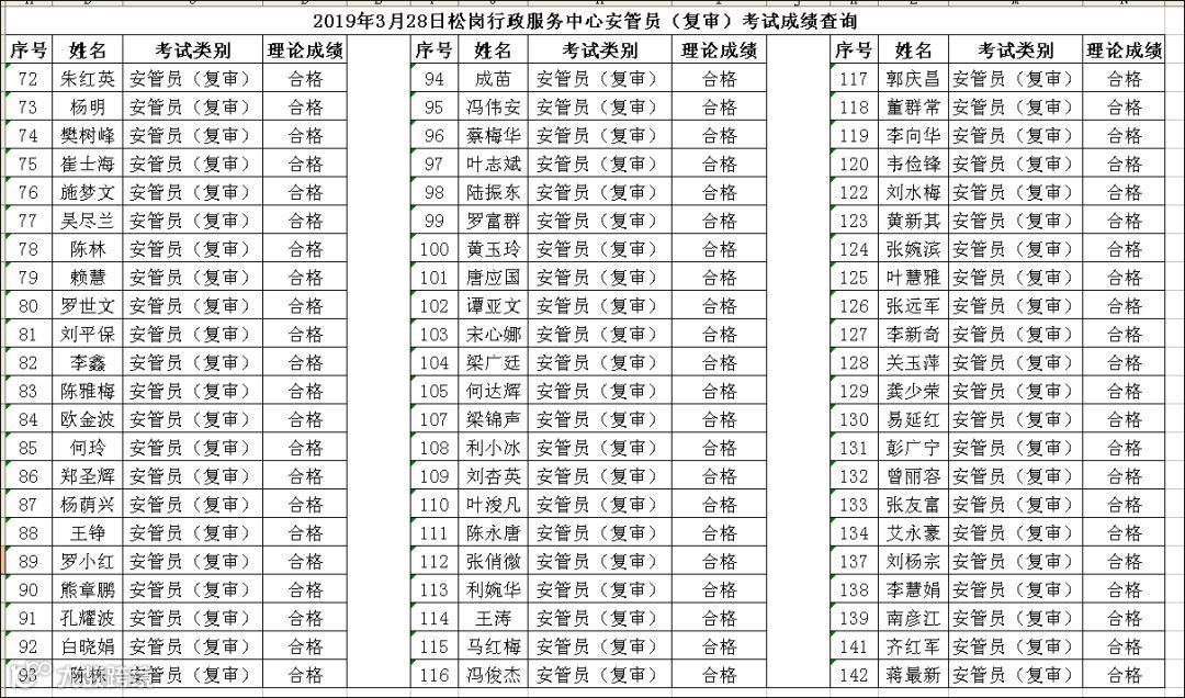 2019.03.28松岗行政服务中心安管员(复审)考试成绩查询