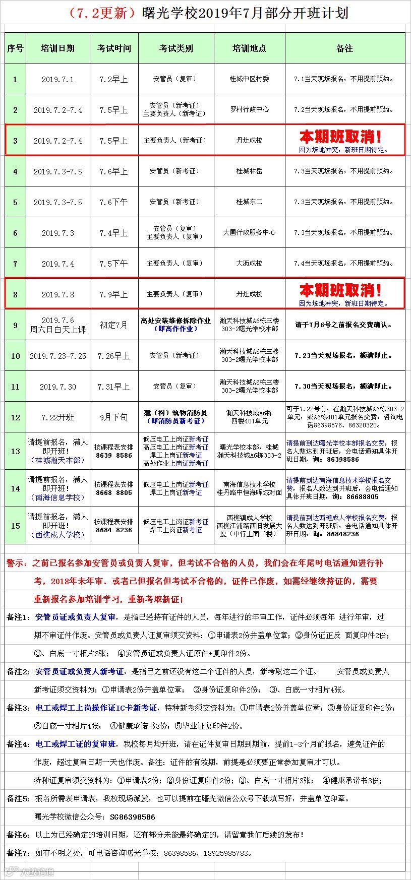 另外,原定于7.2-7.5在丹灶成校开办的主要负责人新考证班,以及7.8-7.9在丹灶成校开办的主要负责人复审班,因为场地临时有其他安排无法协调原因,需要临取消,新的开班日期待定,请留意我校后续的发布更新,请互相知悉,造成不便,敬请谅解!