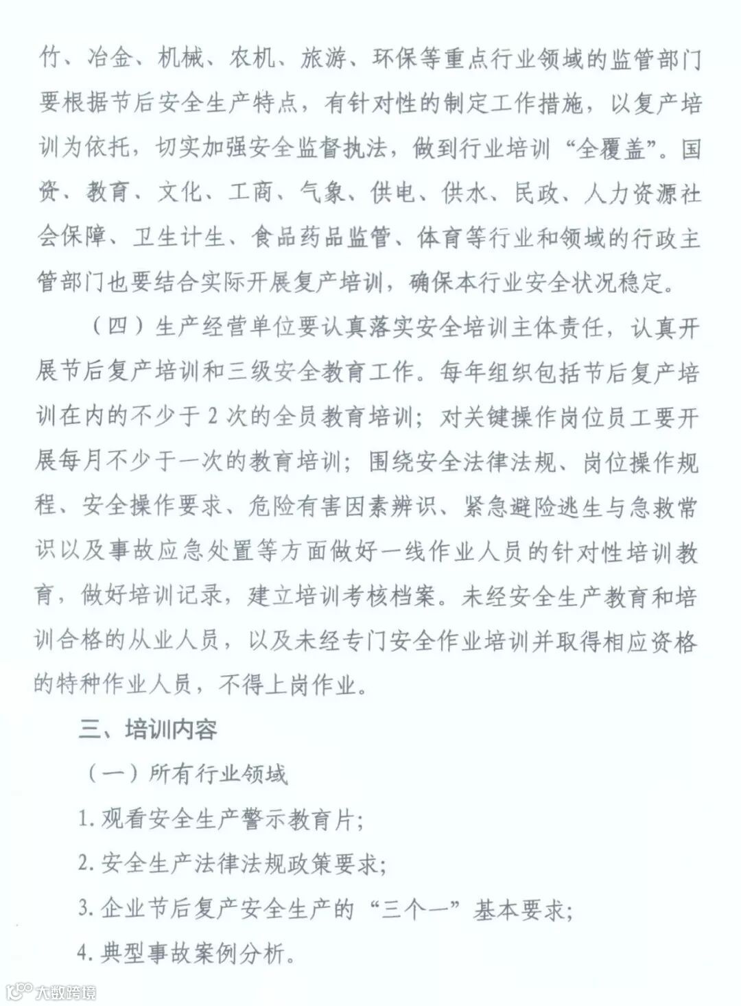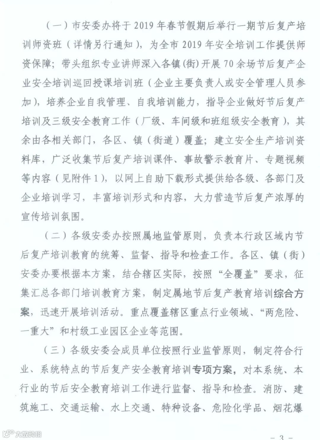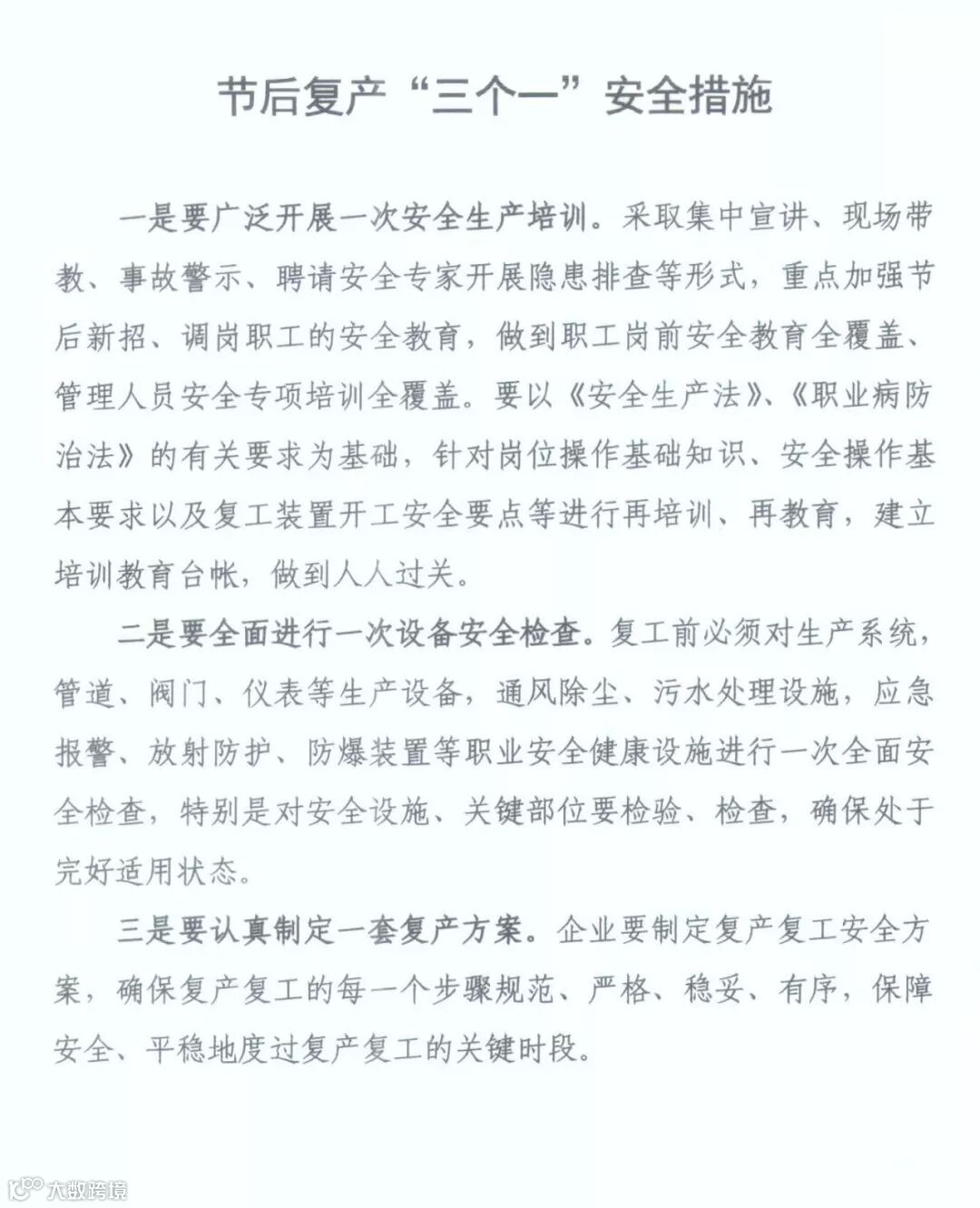 牢固树立“安全培训不到位就是重大安全隐患”的意识,准确把握节后复产安全生产特点,充分认识做好企业复产安全教育培训工作的极端重要性,按照“三个必须”和“行业监管与属地监管”相结合原则,强化节后复产安全培训工作部署和专项检查督查,督促企业落实安全生产主体责任,全面落实“三个一”(即进行一次全员安全生产培训,制定一套节后复产方案,完成一次复产前设施设备的全面检修)安全防范措施,认真抓好节后从业人员全员安全培训教育,有效防范和遏制各类事故的发生,维护全市安全形势稳定。