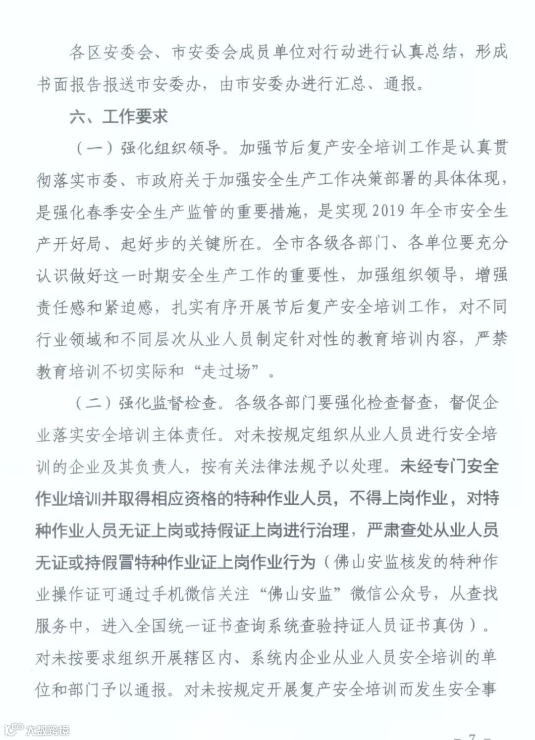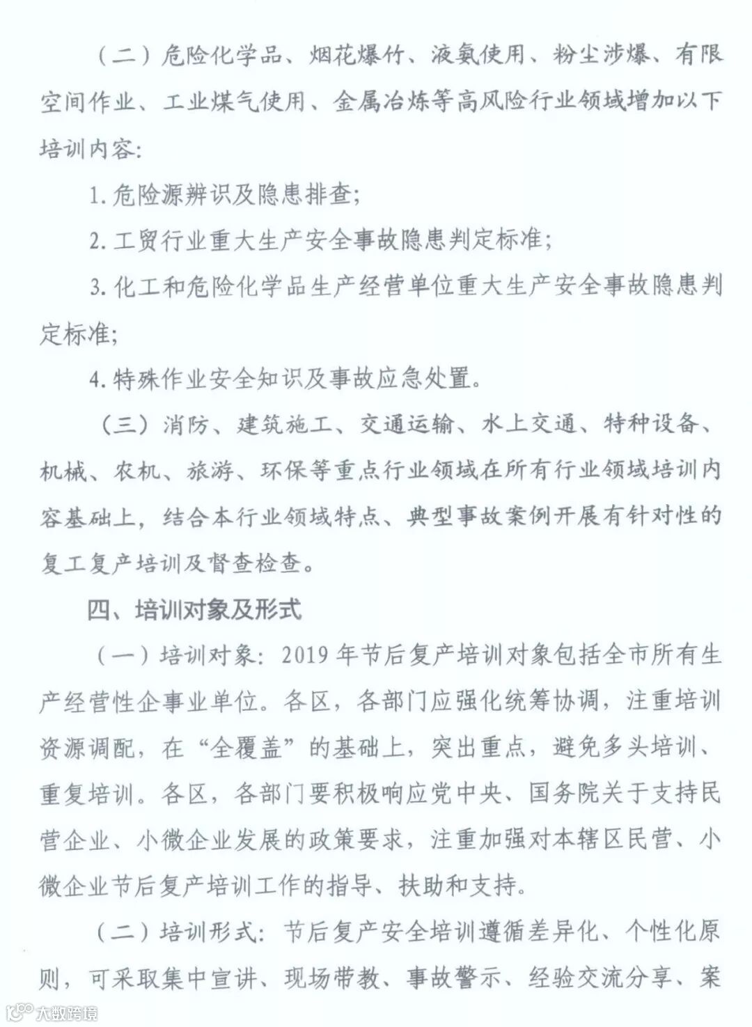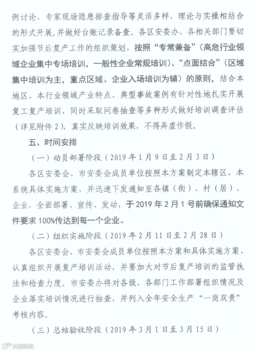 牢固树立“安全培训不到位就是重大安全隐患”的意识,准确把握节后复产安全生产特点,充分认识做好企业复产安全教育培训工作的极端重要性,按照“三个必须”和“行业监管与属地监管”相结合原则,强化节后复产安全培训工作部署和专项检查督查,督促企业落实安全生产主体责任,全面落实“三个一”(即进行一次全员安全生产培训,制定一套节后复产方案,完成一次复产前设施设备的全面检修)安全防范措施,认真抓好节后从业人员全员安全培训教育,有效防范和遏制各类事故的发生,维护全市安全形势稳定。
