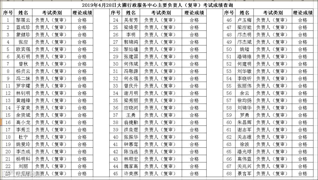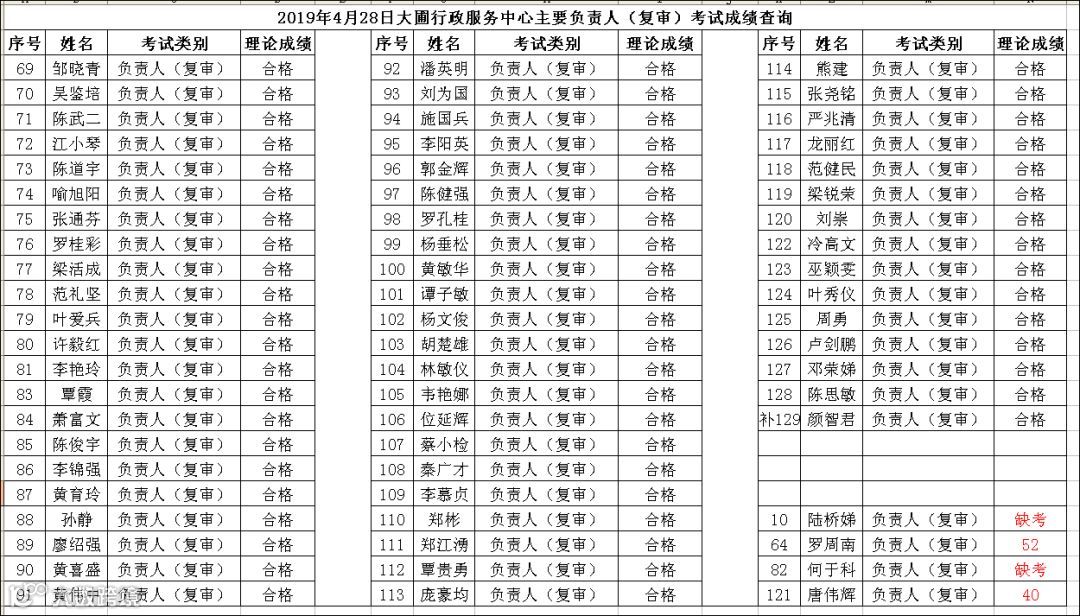 2019.04.28大圃行政服务中心主要负责人(复审)考试成绩查询