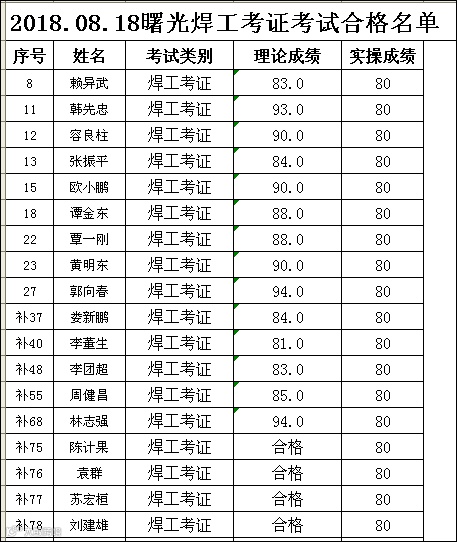 2018.08.18曙光焊工(考证)考试合格名单