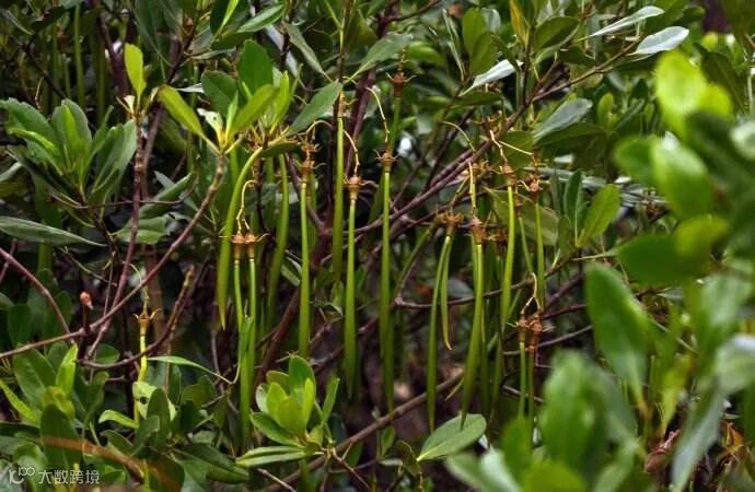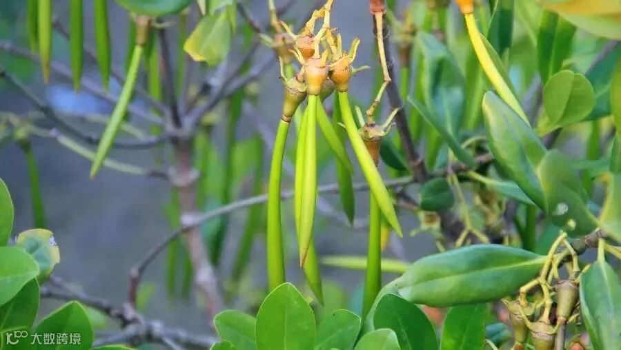 很多红树植物都有奇妙的“胎生现象”,种子还没有离开母体的时候就已经在果实中开始萌发长成胚轴。胚轴发育到一定程度后脱离母树,几小时后就能在淤泥中扎根生长而成为新的植株,未能及时扎根的胚轴会随着海流在大海上漂流数个月,在几千里外的海岸扎根生长。