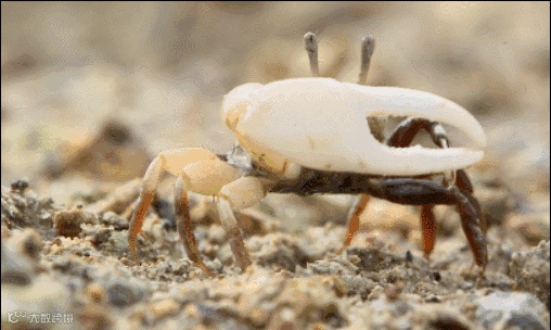 在红树林区生活的蟹类中数量最多,最为人熟知的就是招潮蟹,它们成群穴居海滩,以含有机碎屑的泥土为食。涨潮时,它常用力挥动大螯,好像在招唤潮水,因此得名“招潮蟹”。