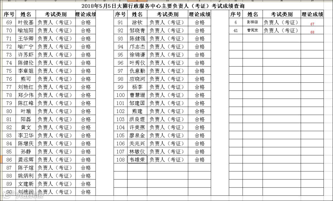 2018.05.05大圃行政服务中心主要负责人(考证)考试成绩查询