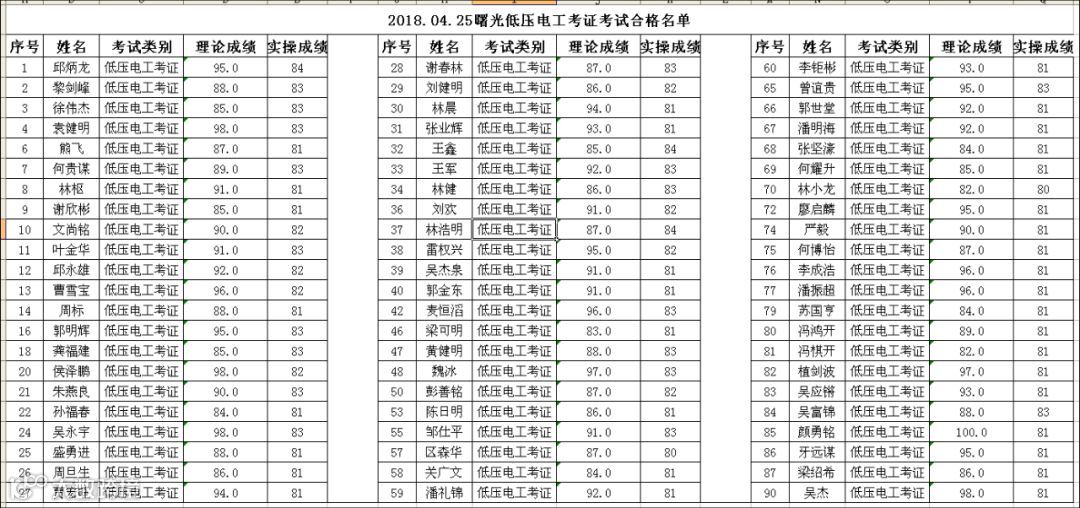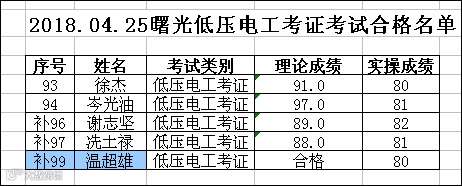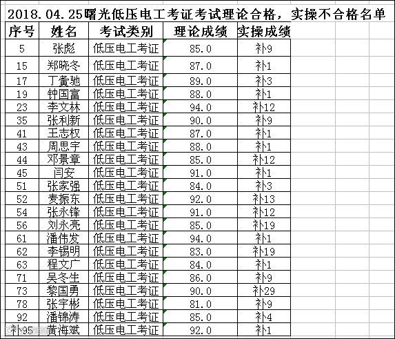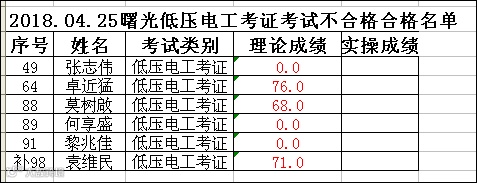 2018.04.25曙光低压电工(考证)考试理论合格,但实操不合格名单