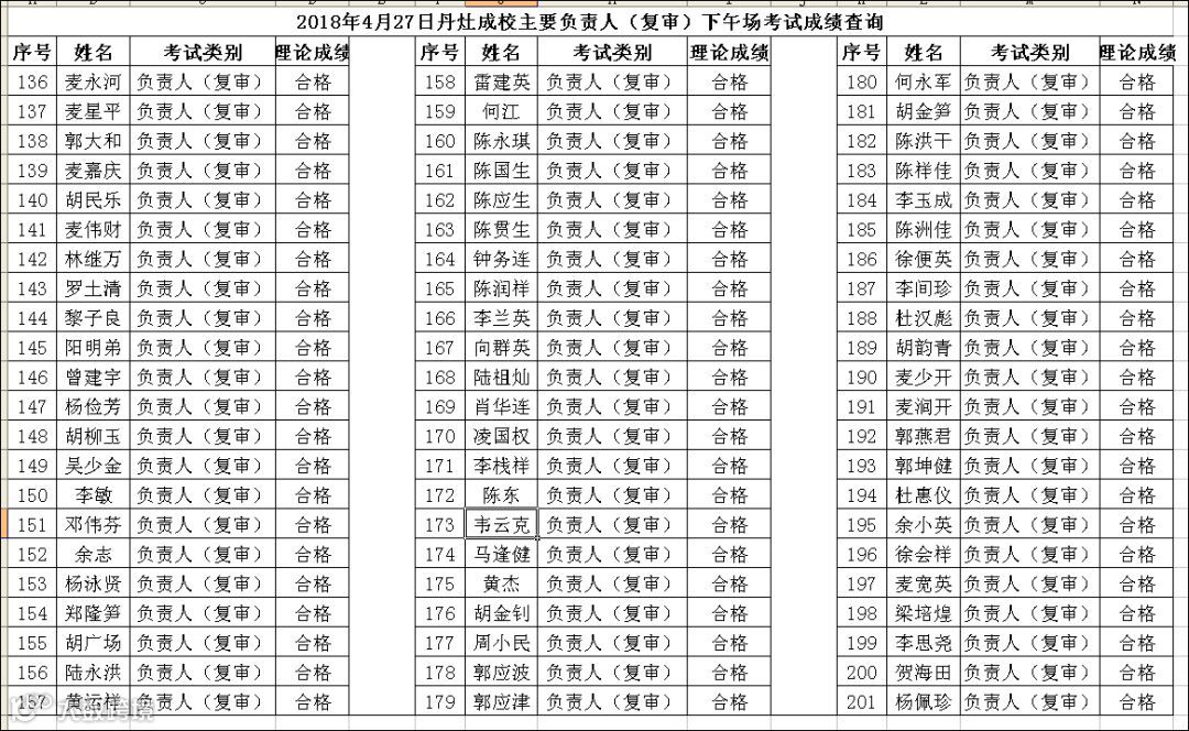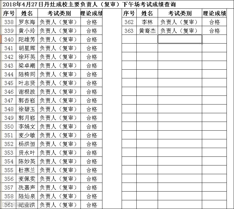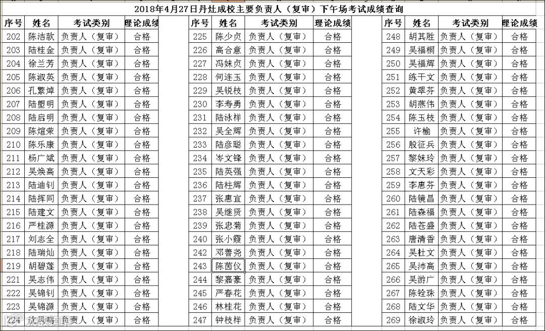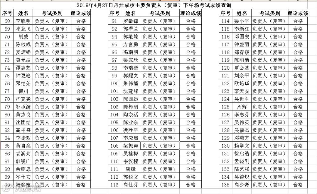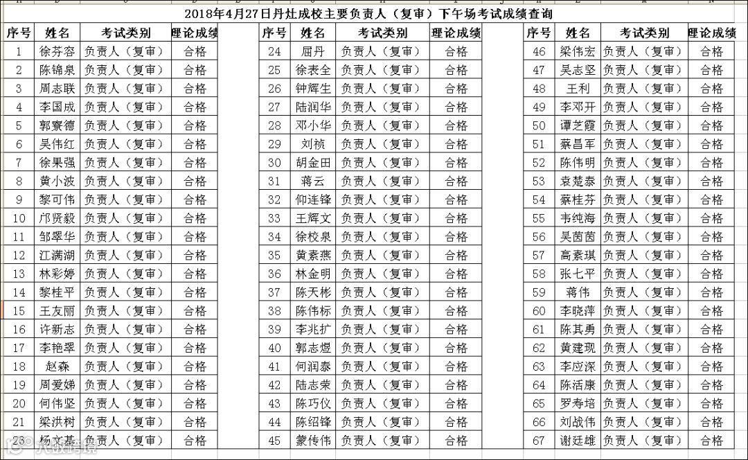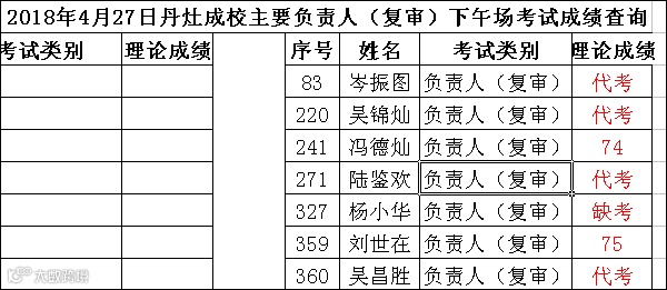 2018.04.27丹灶成校主要负责人(复审)下午场考试成绩查询