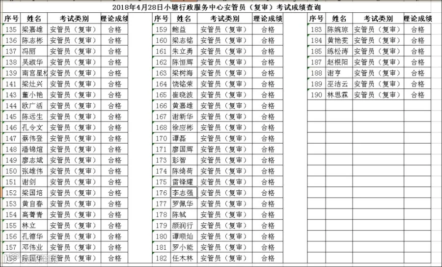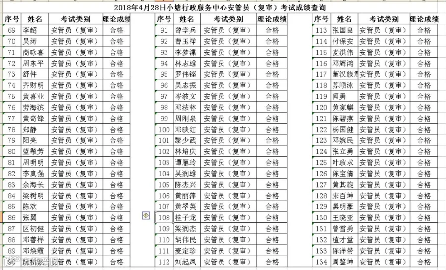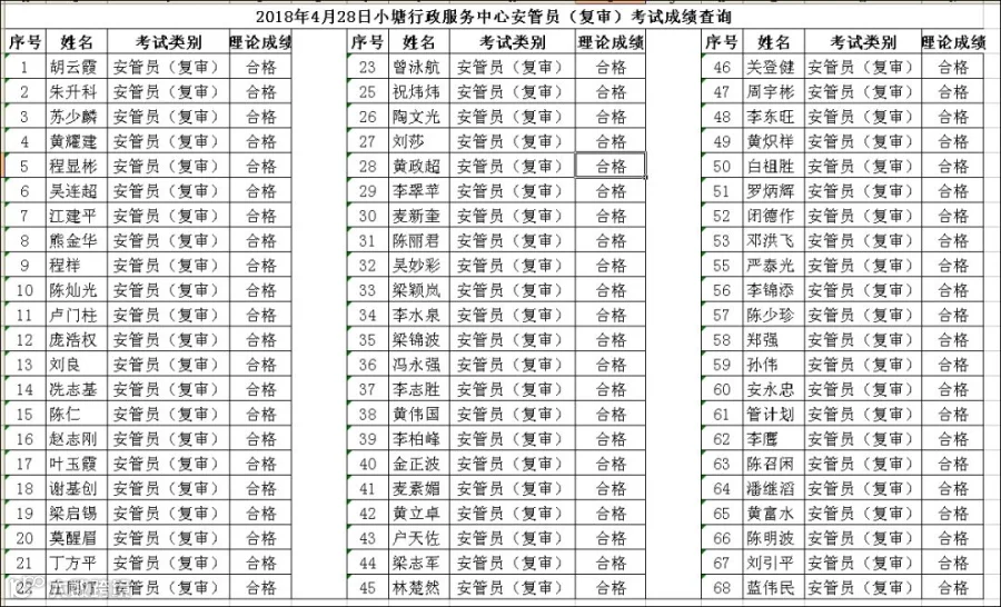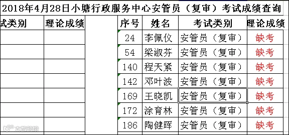 导读:2018.04.28小塘行政服务中心安管员(复审)考试成绩查询