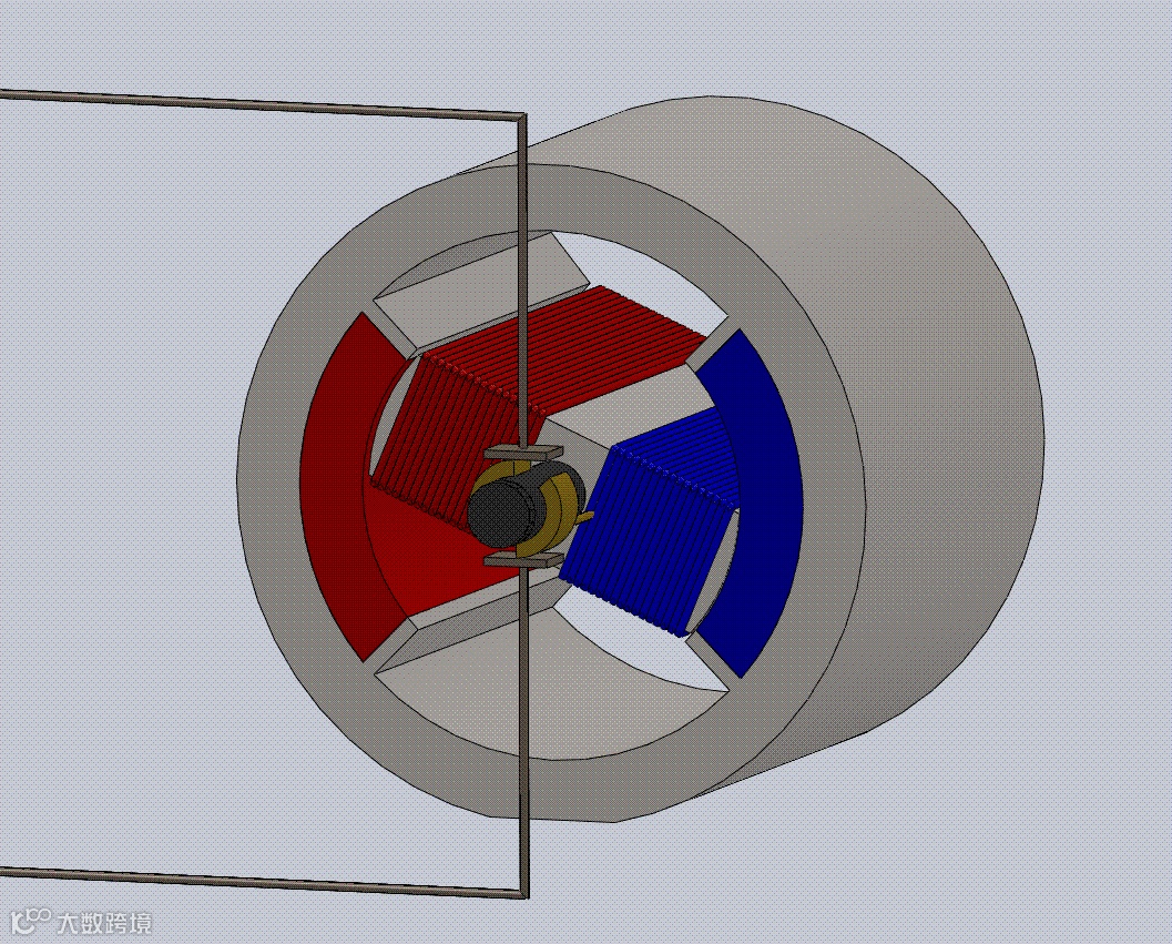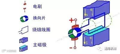 上图的直流电机的物理模型图,固定部分有磁铁,这里称作主磁极;固定部分还有电刷。转动部分有环形铁心和绕在环形铁心上的绕组。(其中2个小圆圈是为了方便表示该位置上的导体电势或电流的方向而设置的)
