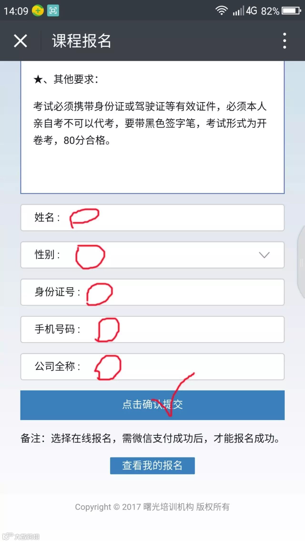 6、大家提交后会要求你微信转帐交报名费,请确定微信金额可以够交费,需要交费之后才能够报名成功,我们在电脑后台才可以看得到你的记录,如果没交费成功的,是没记录的,不明处可询18925985783: