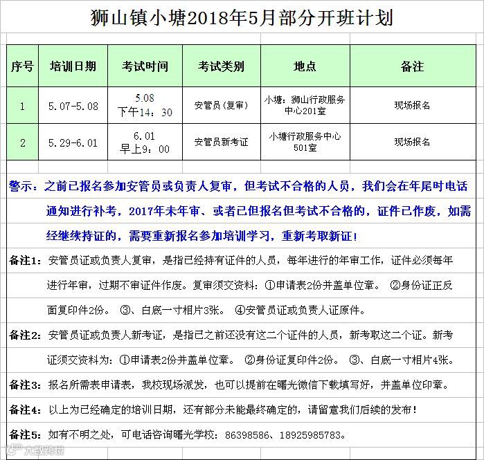 小塘片区5月安管员/负责人份开班计划 佛山市曙安安全技术服务公司