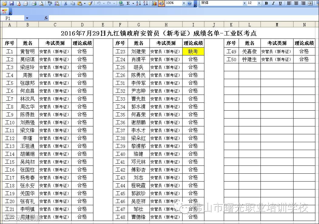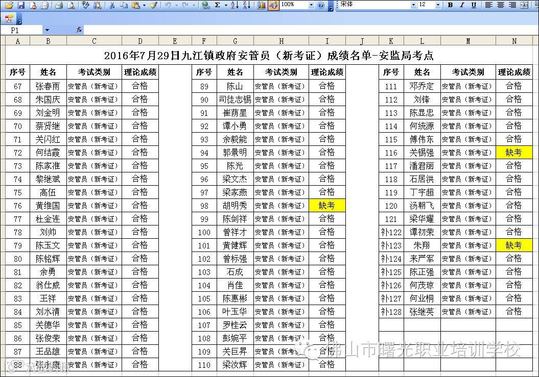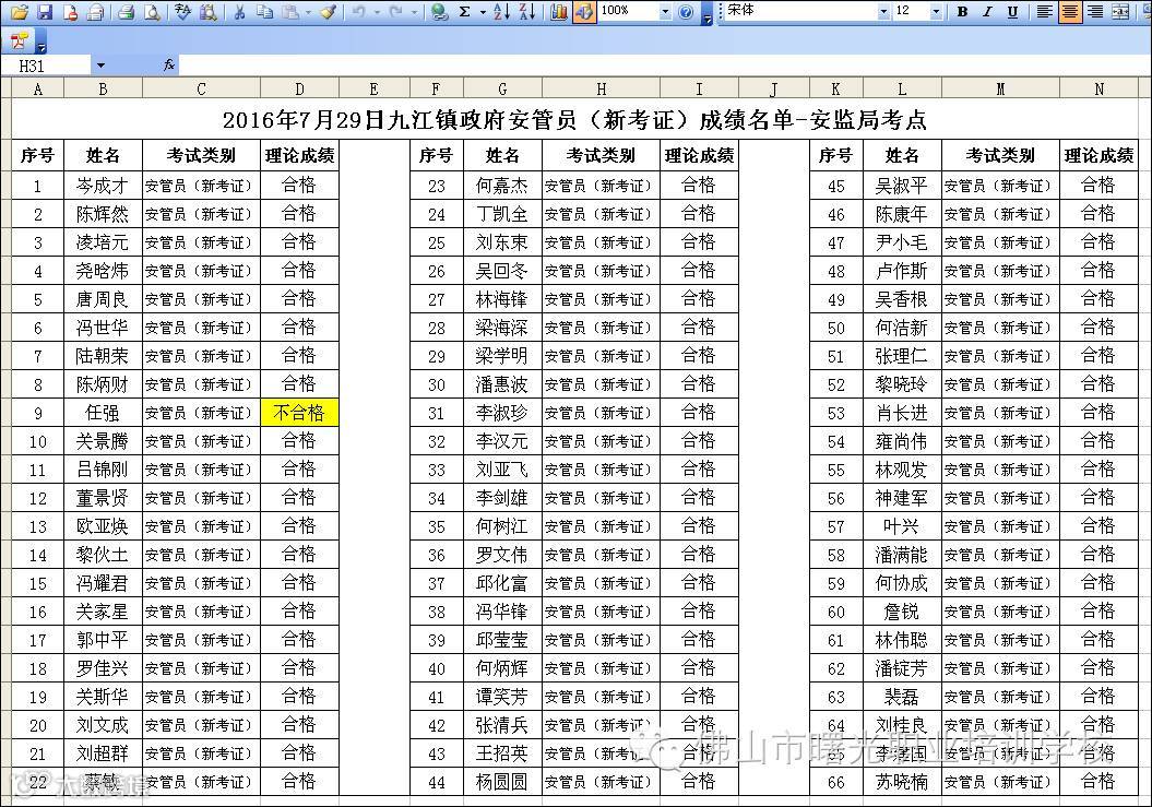 2016.7.29九江镇安管员(新考证)考试成绩名单 佛山市曙安安全技术服务公司