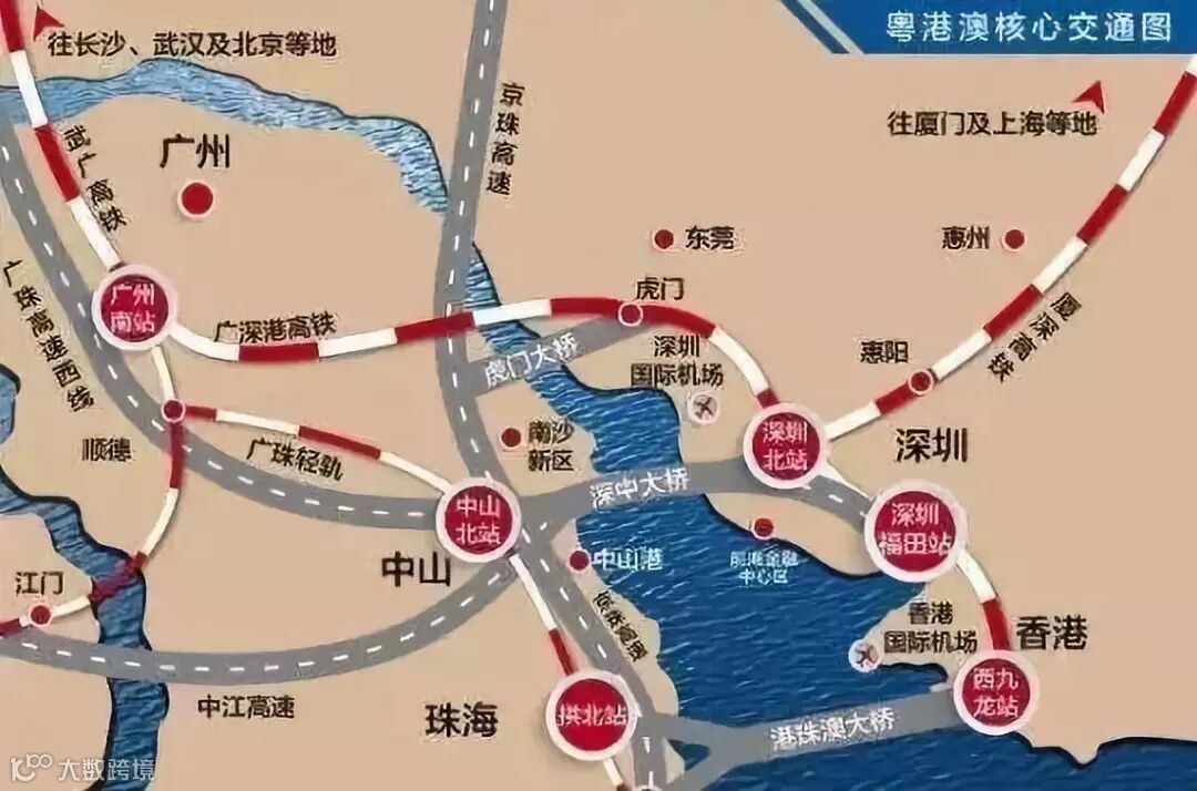 构筑大湾区快速交通网络。以连通内地与港澳以及珠江口东西两岸为重点,构建以高速铁路、城际铁路和高等级公路为主体的城际快速交通网络,力争实现大湾区主要城市间1小时通达。编制粤港澳大湾区城际(铁路)建设规划,完善大湾区铁路骨干网络,加快城际铁路建设,有序规划珠三角主要城市的城市轨道交通项目。加快深中通道、虎门二桥过江通道建设。创新通关模式,更好发挥广深港高速铁路、港珠澳大桥作用。推进莲塘/香园围口岸、粤澳新通道(青茂口岸)、横琴口岸(探索澳门莲花口岸搬迁)、广深港高速铁路西九龙站等新口岸项目的规划建设。加强港澳与内地的交通联系,推进城市轨道交通等各种运输方式的有效对接,构建安全便捷换乘换装体系,提升粤港澳口岸通关能力和通关便利化水平,促进人员、物资高效便捷流动。