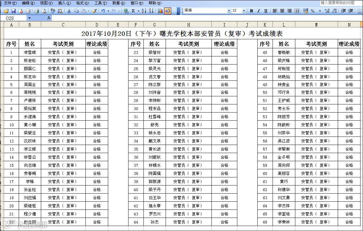 2017.10.20(下午)曙光学校安管员(复审)考试成绩名单 佛山市曙安安全技术服务公司