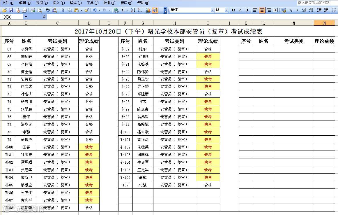 2017.10.20(下午)曙光学校安管员(复审)考试成绩名单