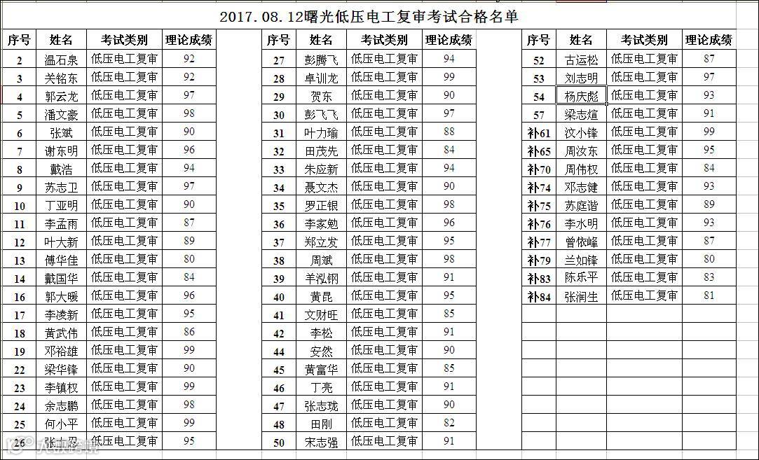 2017.08.12曙光低压电工(复审)合格名单