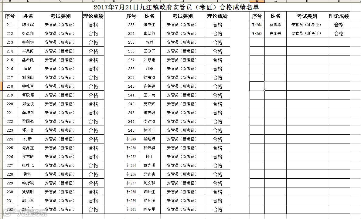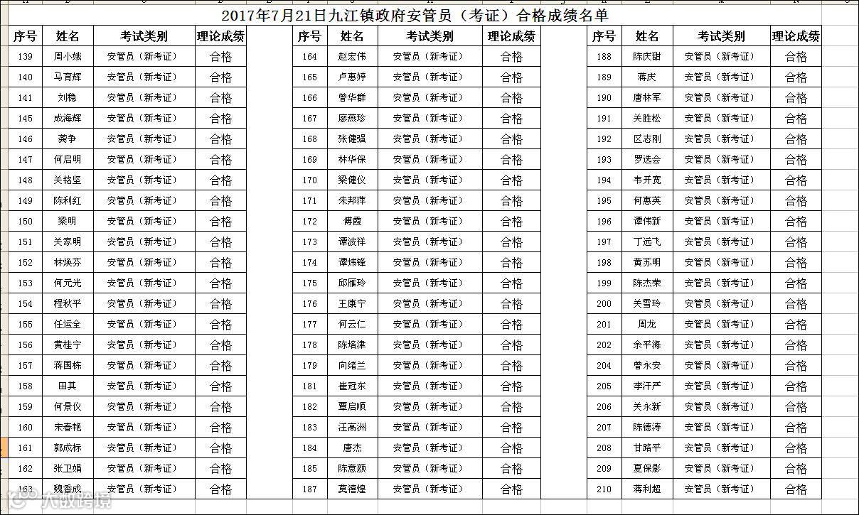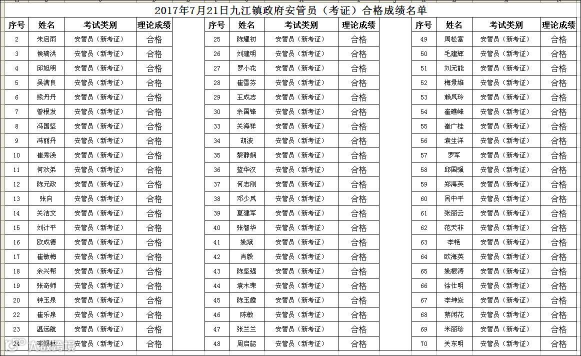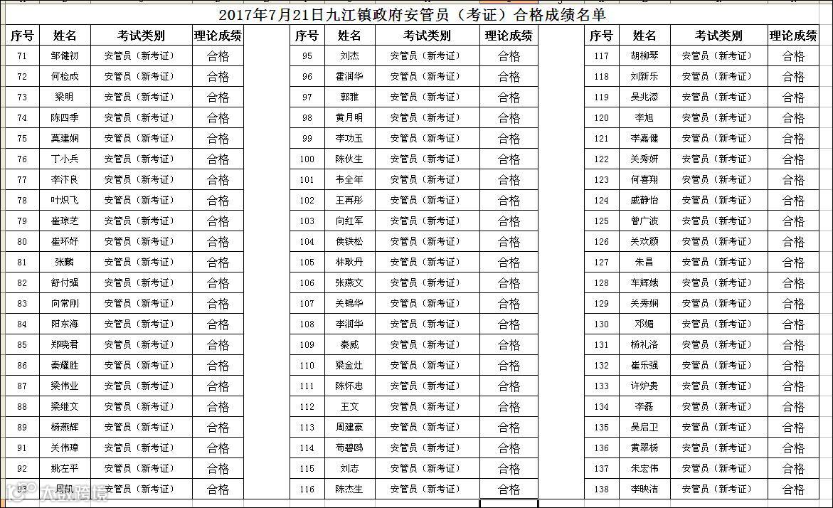 导读:2017.07.21九江镇政府安管员(考证)合格名单