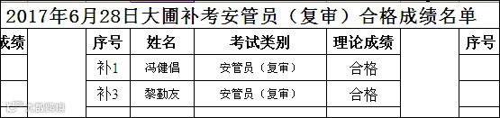 2017.06.28大圃行政服务中心安管员(复审)补考合格名单