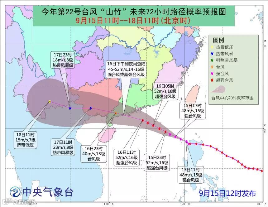 “山竹”的登陆时间由原来预计的16日夜间17日凌晨,现在提前到16日傍晚前后。