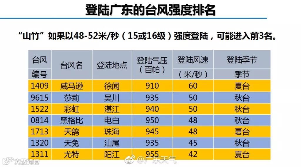 “山竹”如果以48-52米/秒(15或16级)强度登陆,很可能进入1961以来登陆广东的台风强度排名前3名。甚至比去年强台风“天鸽”强度更强,与2015年超强台风“彩虹”强度相当。