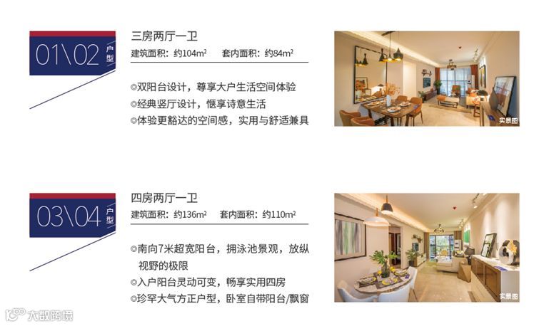 建面约104㎡三房,双阳台设计为高尚起居引荐阳光与新风,更可随时浏览窗外变化的四季景色。体验再升级!建面约136㎡四房,任享舒适百变空间。超阔阳台与双厅相连,主卧采用套房标准进行设计,疏朗空间容纳更多私享品位,不仅配备独立卫浴系统,还配备更便利的收纳空间。整个户型布局合理,将个人办公、学习、娱乐等功能极致融合,隔绝外界打扰,保证整个空间生活内容的区分及业主的私密性。