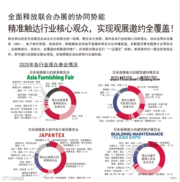 日本亚洲家具展“Asia Furnishing Fai"是日本家具及室内装饰行业专业的贸易展览会。联合日本家居建材行业几大品牌展会,共同打造日本规模最大一站式住空间集群展住空间集群展。与日本建筑建材展"Japan Home &Building Show”、日本布艺家纺展“JAPANTEX"共同构成“建筑暨室内装饰周”,三展联合共享资源相互合作扩大影响。