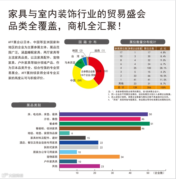 日本亚洲家具展“Asia Furnishing Fair”是专注于家具与室内装饰领域的专业贸易展览会,本届为第十一届。自第二届起,该展会已发展成为日本规模最大的家具及室内装饰专业展会,并于东京国际展览中心(Tokyo Big Sight)举办--该场馆是日本举办各类大型国际展会的重要场所。展会汇聚了来自日本及亚洲其他国家和地区的众多优质参展企业,展品涵盖睡眠家具、两厅家具、宠物家具、户外家具等全品类家具产品,吸引了大批具有专业眼光与高品位需求的海内外买家莅临参观与采购。