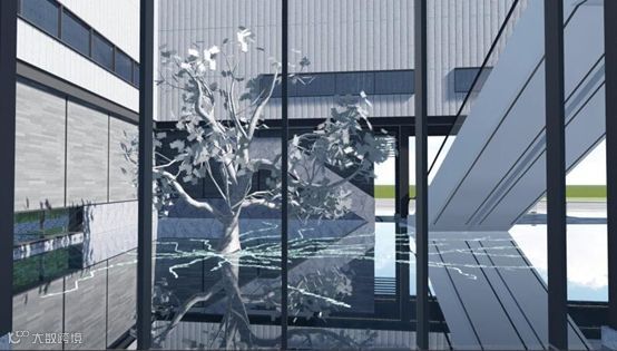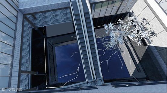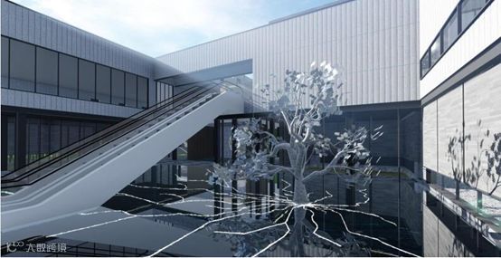 水波、树、和通过玻璃穹顶连接的蓝天一起,构成一个奇妙的设计空间,萌芽、生长、共同经历四季的变化,生机勃勃。这一组造景暗喻着保利远洋领秀山的生活大镜在这个原点荡起涟漪,蔓延开来。