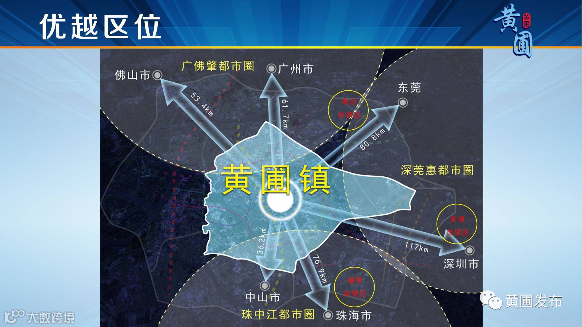 黄圃镇地处中山北部,西北与佛山顺德接壤,东北与广州南沙相邻,位居粤港澳大湾区城市群几何中心,与广州、深圳、香港等同处1小时交通圈内。
