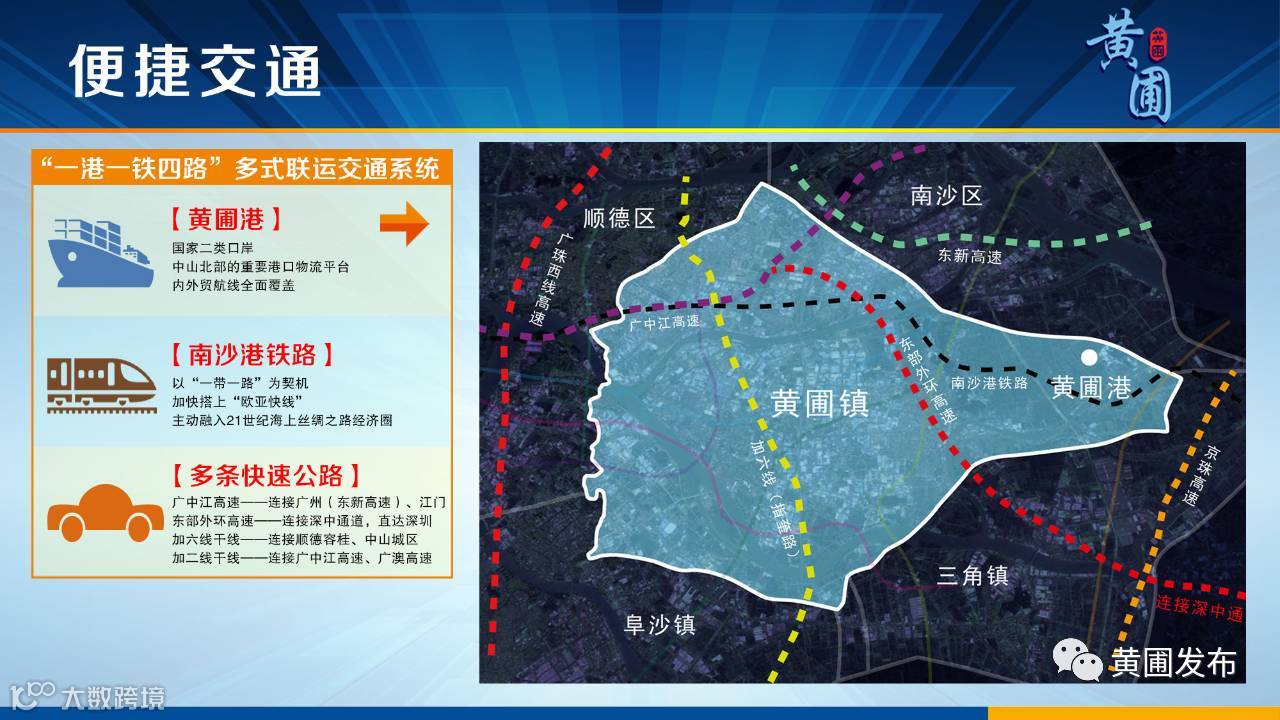 作为中山的北大门,黄圃镇毗邻广佛都市圈和南沙自贸区,包括南沙港铁路在内,在建和将建的广中江高速公路、加二线、黄圃快线、东部外环高速公路等快速路网,将大大提升黄圃的区位优势,加上黄圃港货运码头和南沙港铁路在中山境内设立唯一的货运站场,黄圃镇将成为全市唯一集“公、铁、水”多式联运于一体的综合性交通枢纽,区位优势更加凸显。