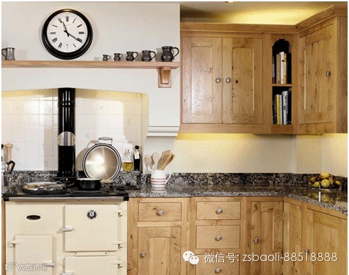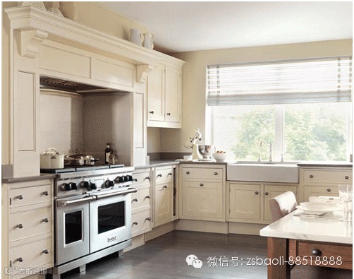 灶台上的封闭设计宛如乡村的壁灶,整个厨房弥漫着浪漫的法式乡村风格。多抽屉与多柜门的设计,展现了强大的收纳功能,使厨具能分门别类的收纳其中。灶台下的烤箱镶嵌在其中,合理地利用了空间。