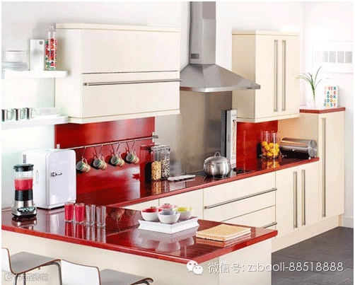 这款L型厨柜是白色和红色现代感搭配。灶台上金属材质的挡板,方便主妇们的日常清洁。L型的一边的吧台,一杯鲜艳的鲜榨果汁,是休闲之余不错的选择。