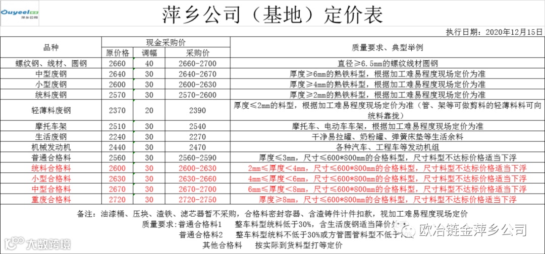 导读:12月15日起,欧冶链金(萍乡)再生资源有限公司基地部分毛料采购价大幅调整,详情见价格表.