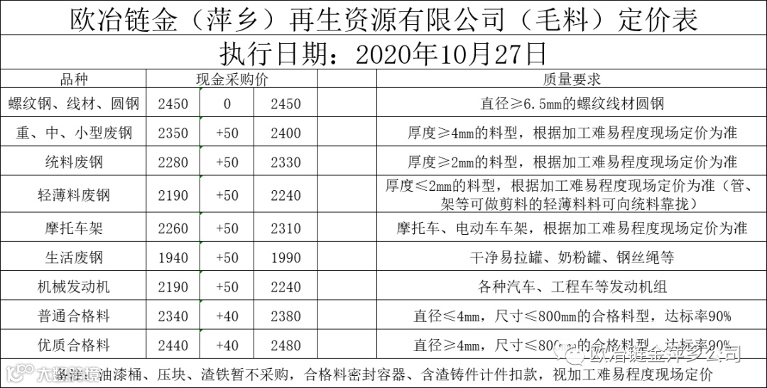 从10月27日起,散料废钢所有料型上调50元/ 吨,破碎料上调30元/吨,钢筋压块和边角料压块上调20元/吨,打包废钢压块、普通压块上调10元/吨,其他料型价格不变。
