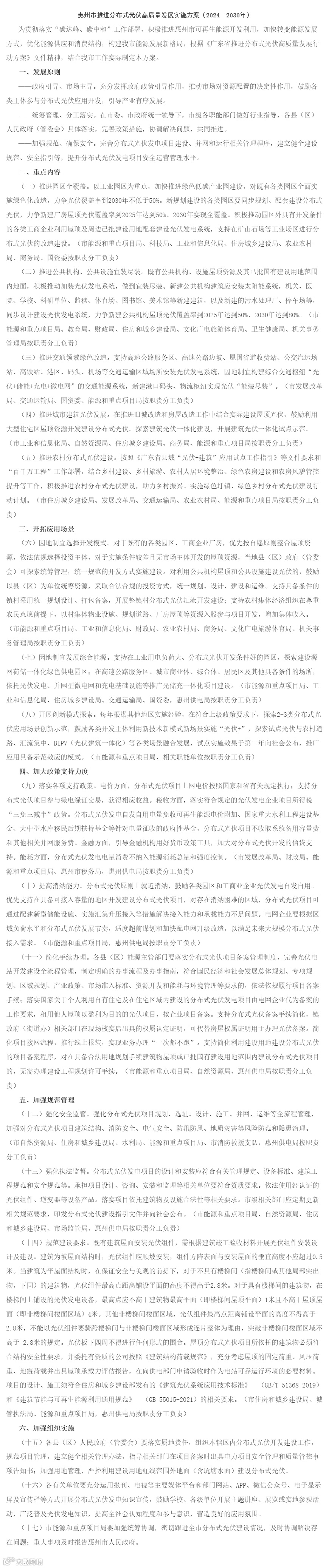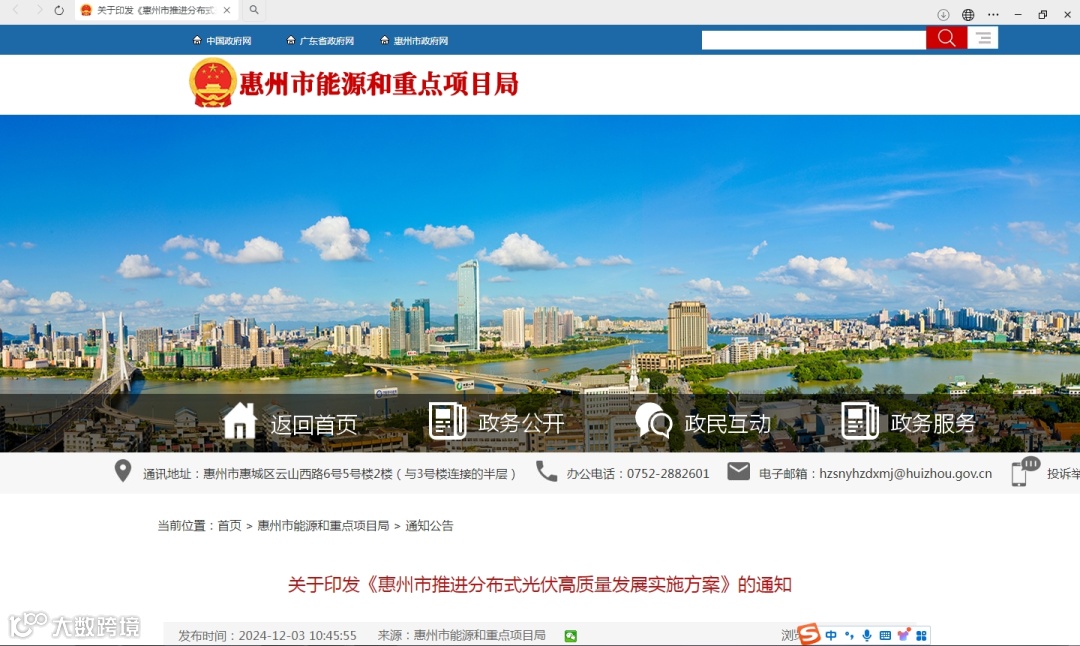 12月4日,惠州市发布《推进分布式光伏高质量发展实施方案(2024—2030年)》,旨在通过政府引导、市场主导,推进园区、公共机构、交通、城市建筑及农村分布式光伏建设,并加大政策支持,简化手续,加强规范管理,以促进能源结构优化和“碳达峰、碳中和”目标实现。