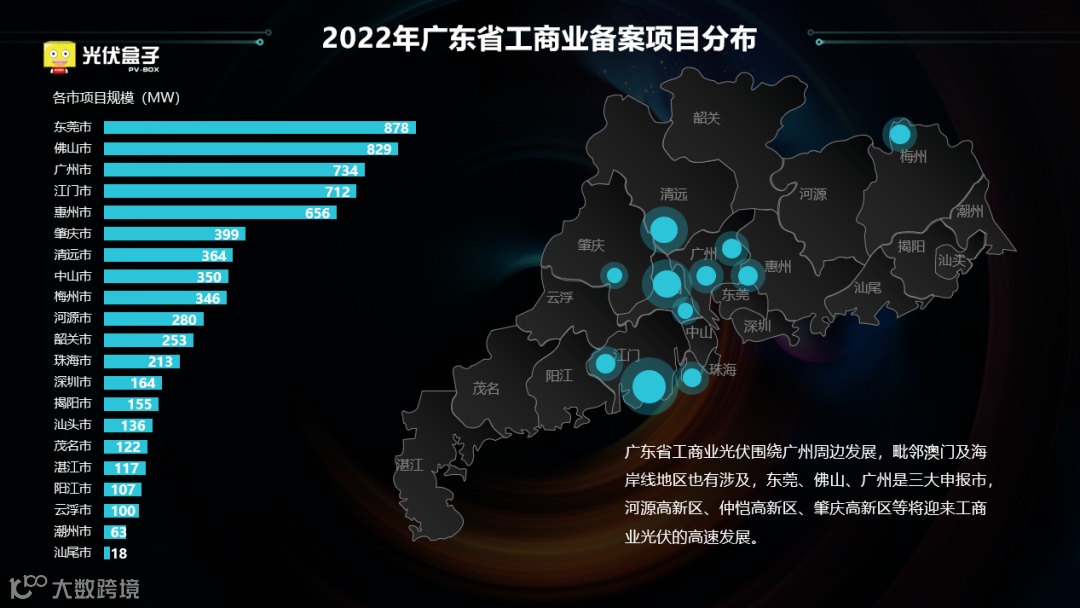 从地域分布来看,2022年广东新增工商业备案项目主要围绕广州市周边发展,毗邻澳门及海岸线地区也有涉及,东莞、佛山、广州是三大申报市,河源高新区、仲恺高新区、筆庆高新区等将迎来工商业光伏的高速发展。