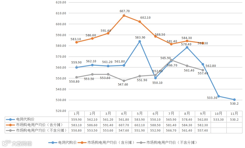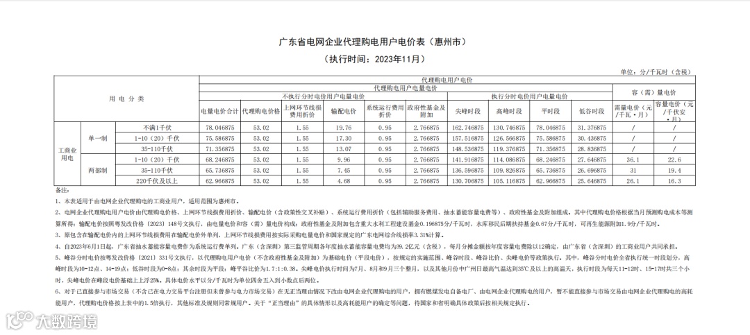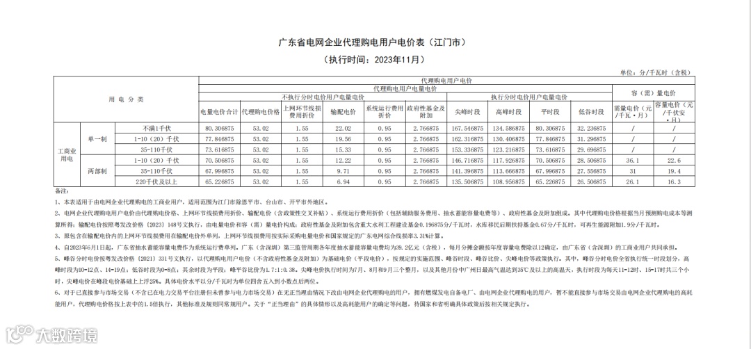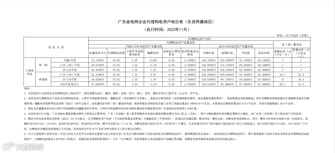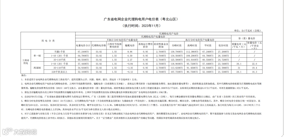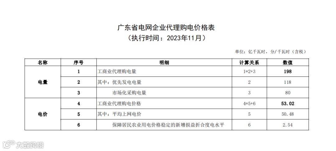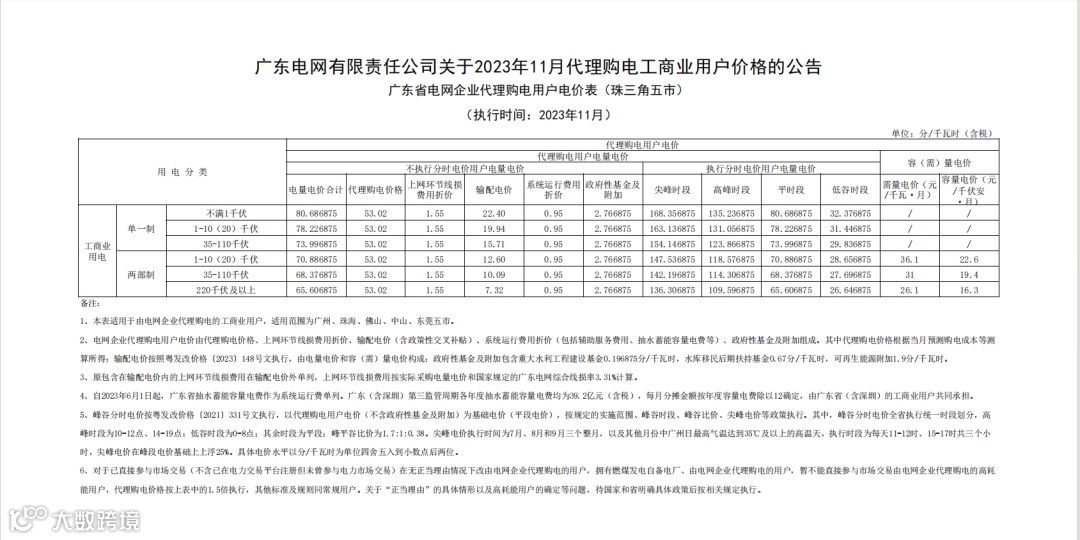 近日,广东电网有限责任公司公布了广东省2023年11月网电代理购电格价,为0.5302元/千瓦时,与10月电网代购用户电价0.5333元/千瓦时对比,下降了0.0031元/千瓦时,降幅0.58%。