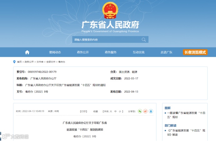 2022年4月13日,广东省人民政府印发《广东省能源发展“十四五”规划》,规划提出:积极发展光伏发电。大力提升光伏发电规模,坚持集中式与分布式开发并举,因地制宜建设集中式光伏电站项目,大力支持分布式光伏。积极推进光伏建筑一体化建设,鼓励发展屋顶分布式光伏发电,推动光伏在交通、通信、数据中心等领域的多场景应用。“十四五”时期新增光伏发电装机容量约2000万千瓦。