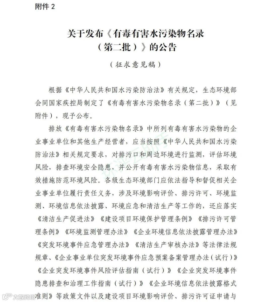 关于公开征求《关于发布〈有毒有害水污染物名录(第二批)〉的公告(征求意见稿)》意见的通知