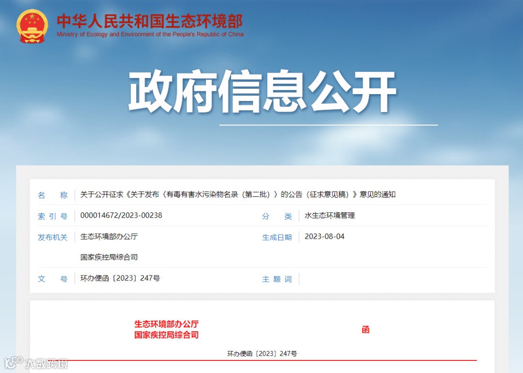 为贯彻落实《中华人民共和国水污染防治法》有关规定,进一步防范环境风险,保护公众健康和生态环境,我部会同国家疾控局组织编制了《有毒有害水污染物名录(第二批)》及相关公告的征求意见稿,现联合公开征求意见。征求意见稿及编制说明可登录生态环境部网站(http://www.mee.gov.cn/)“意见征集”栏目检索查阅。